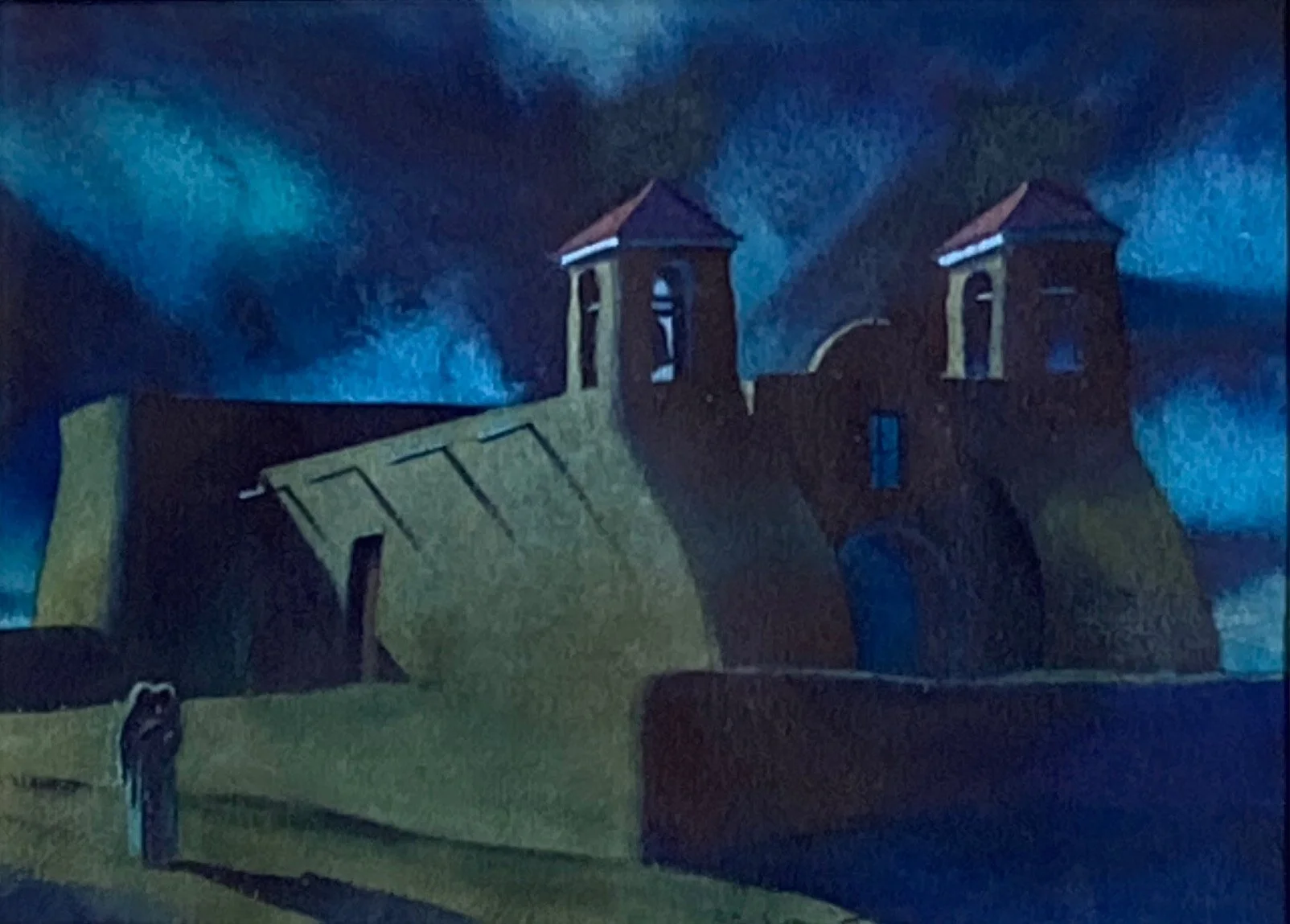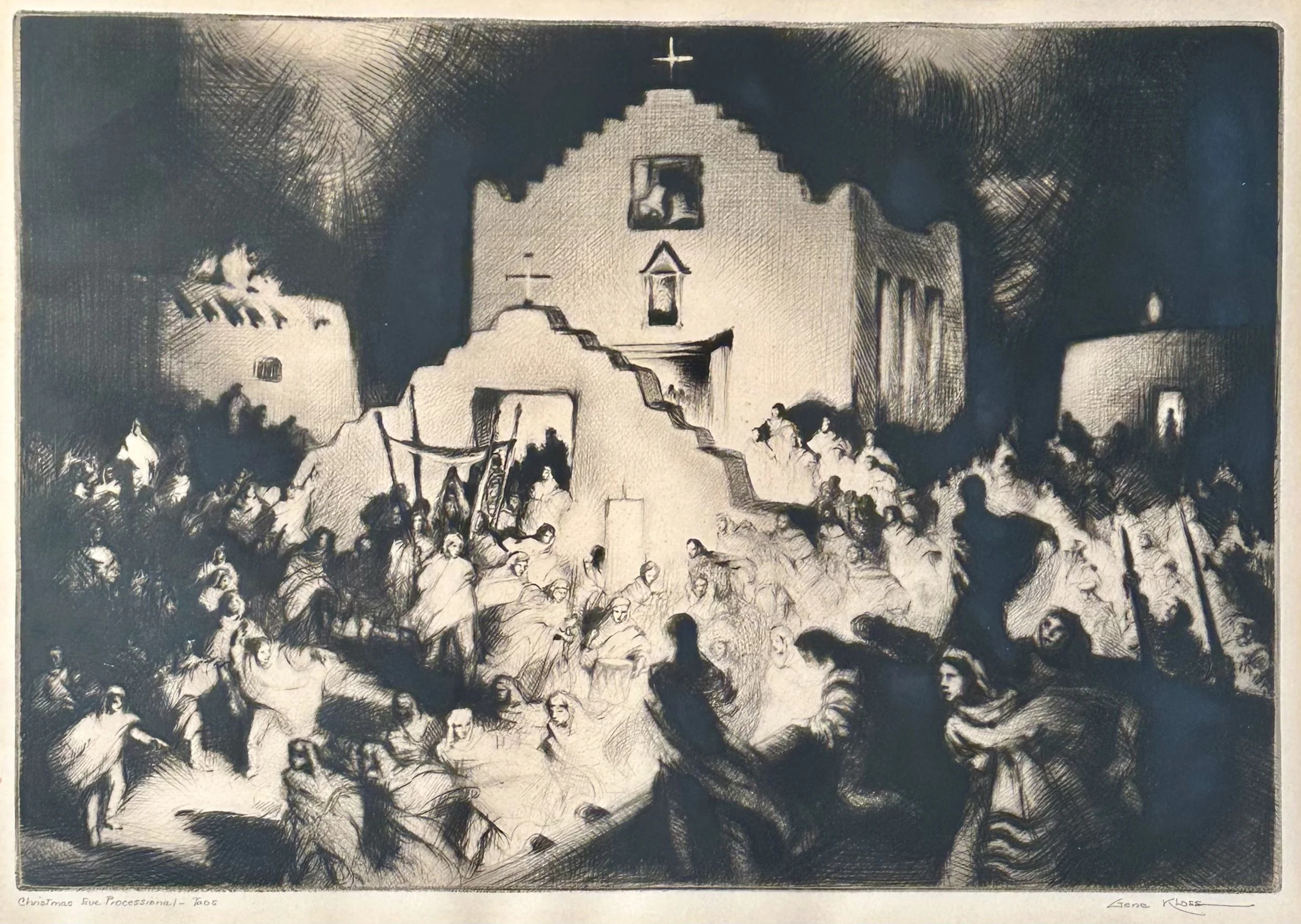 Known for dramatic, chiaroscuro etchings, Gene Kloss’s work featured Taos landscapes, people, and cultural traditions, usually in black and white. This illuminated processional scene is a quintessential example of her style.