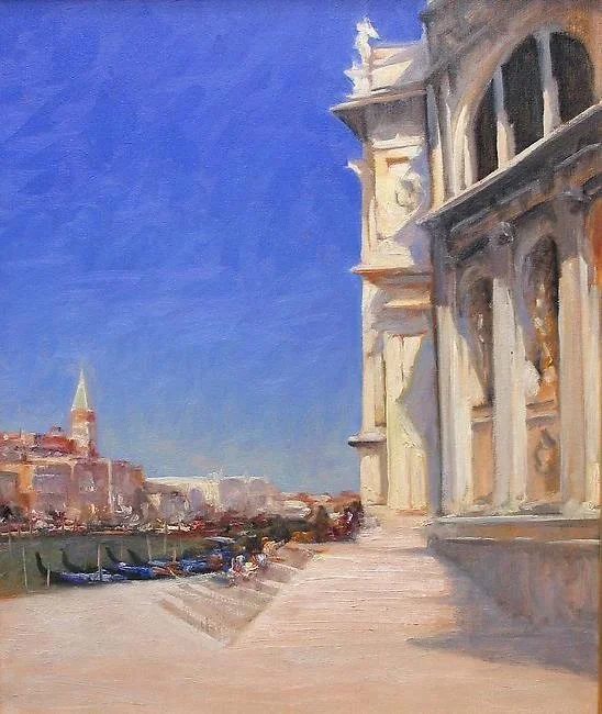 In this unique angle of Venice, William Berra plays with perspective to include a swath of blue sky over Santa Maria della Salute. Berra enjoys pushing the boundaries of the “expected” in his work, experimenting with negative space, canvas, and composition to change the emotion of a scene.