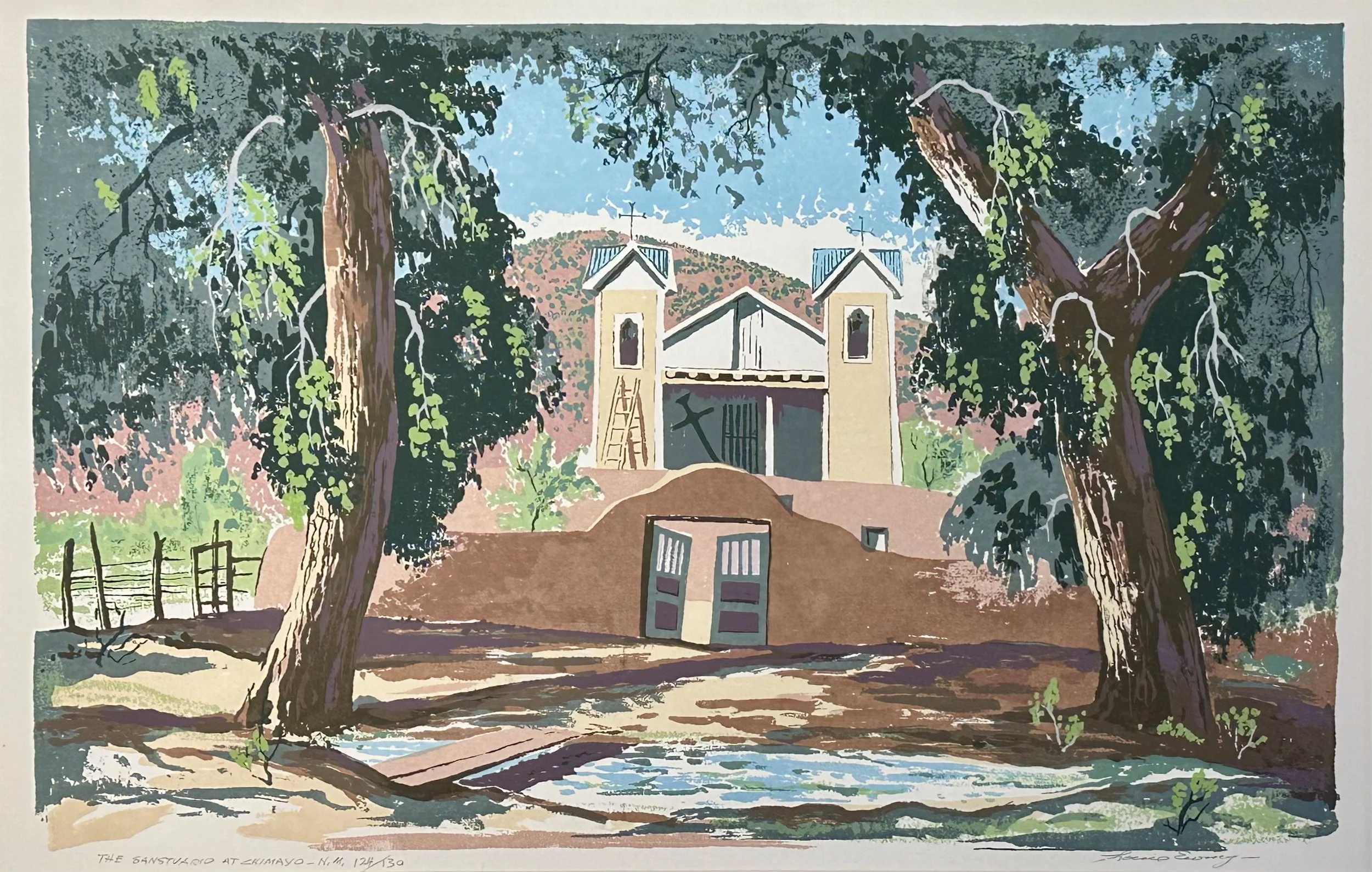 After following his art instructor to Santa Fe in 1935, Louie Ewing became involved in the WPA’s Federal Art Project. When the government sent supplies for silkscreen, Ewing was tasked with mastering the art form to teach new students. This led to Ewing’s renown as one of the first to work creatively with serigraphy.