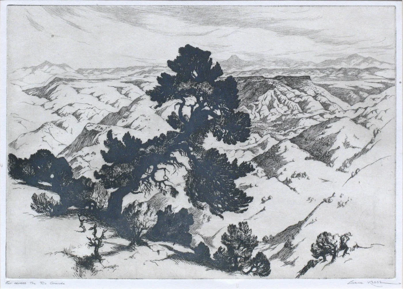Gene Kloss and her husband first visited Taos for their honeymoon in 1925 and fell in love a second time–with the remote mountain village. Kloss would spend 2-4 months a year in Taos (until settling there in 1960), sharpening her skills as a printmaker and painter with the natural beauty, light, and culture so abundant around her.