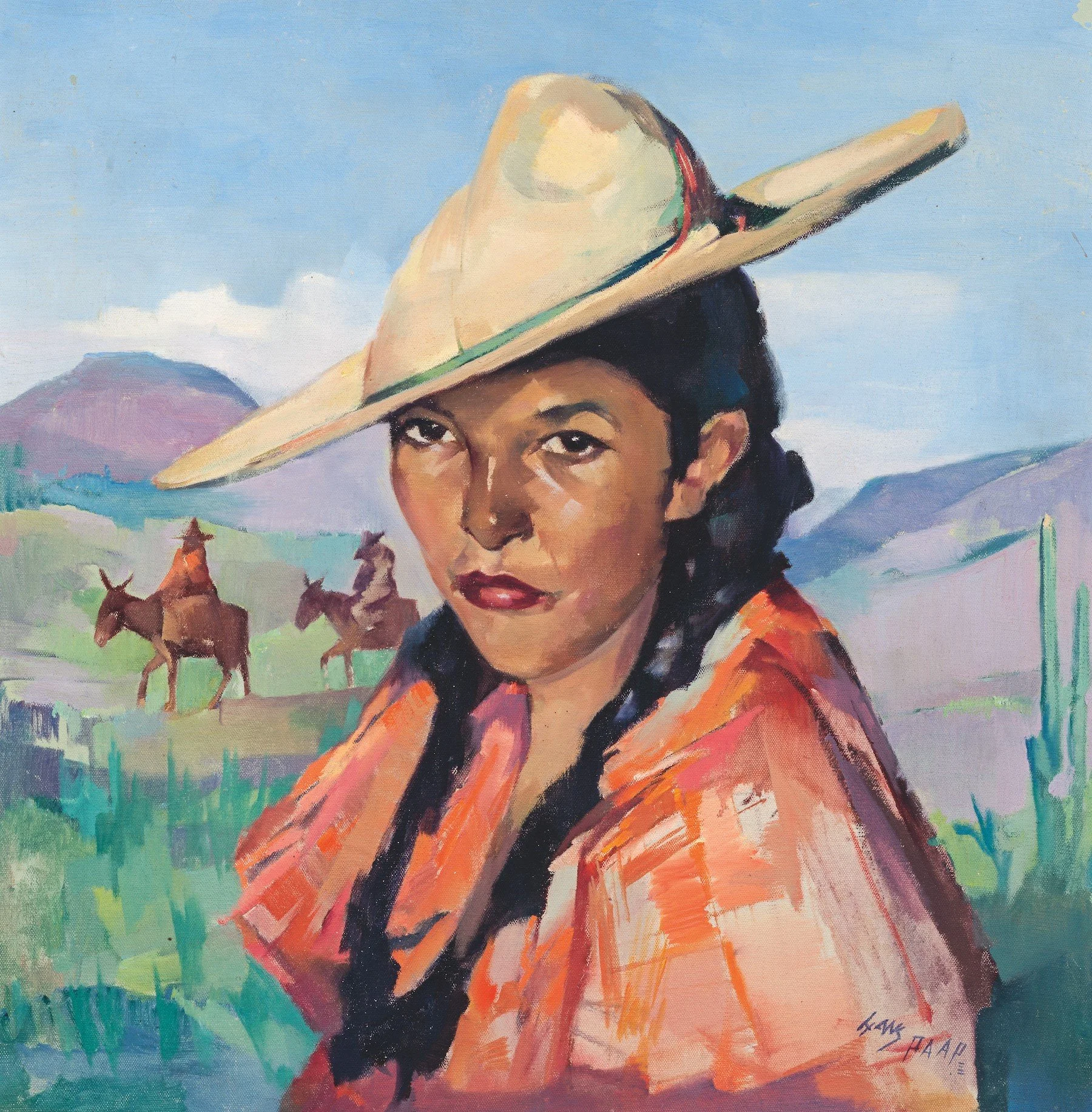 Hans Paap made his career painting the locals and landscapes in a wide variety of regions including Argentina, Brazil, Mexico, Portugal, the Dominican Republic, and the United States. One of the places he found most affecting was Taos, a burgeoning arts community where he formed a deep camaraderie amongst fellow artists such as Kenneth Adams, E. Martin Hennings, and Walter Ufer. “Si Si, Señor” showcases his love for bright, energetic color palettes and romantic views of New Mexico’s inhabitants.