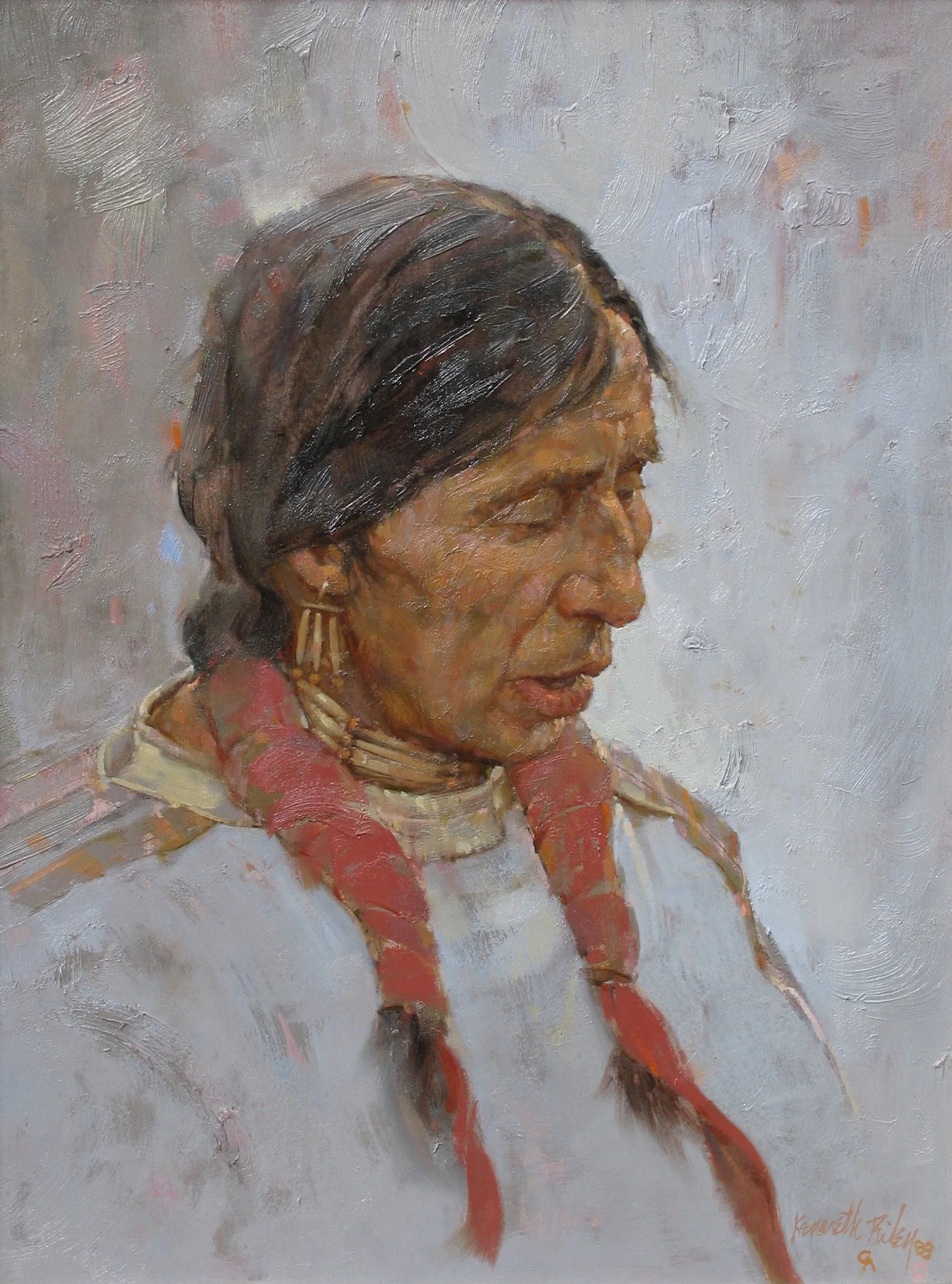 Raised in Kansas and schooled at the Kansas City Art Institute, award-winning painter Kenneth Riley enjoyed a long, successful art career. His skills betray an impressive lineage of training: Riley was a pupil of iconic instructor and painter Harvey Dunn, himself a student of the legendary Howard Pyle. “Blackfoot” demonstrates Riley’s fierce technical ability and understanding of human expression, exhibiting the timeless, airy quality that came to define his work.